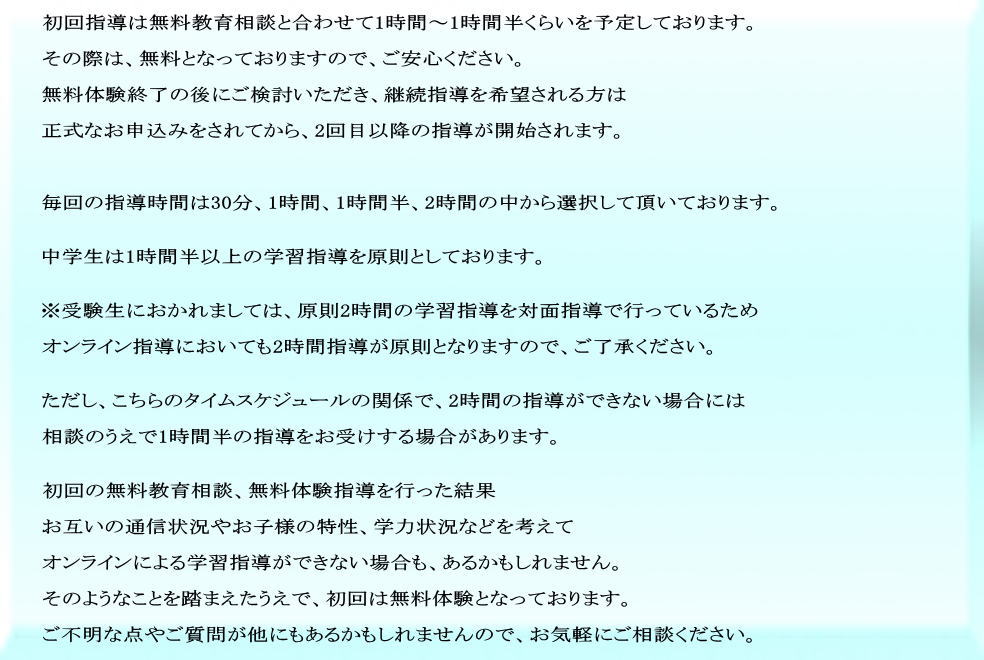 アドバイスなど)+無料体験学習を合わせて1時間~1時間半行います。